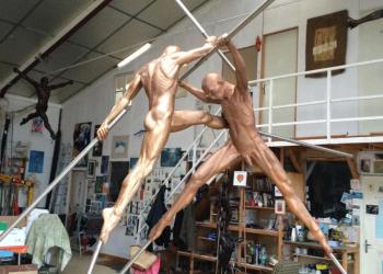 Ma recherche et mon travail m’ont amené à des sculptures en bronze paradoxalement aériennes, célestes, comme envolées par des tripodes, des échasses, des tiges ou des hampes qui les propulsent vers le ciel, sorte de lignes de force, de lignes à haute tension, fulgurantes, vigoureuses, rigoureuses, autant que minimalistes. Elles contrastent singulièrement avec la complexité charnelle du corps humain qui d’un effort intense, d’un élan ou d’une pirouette tente de s’élever, de se détacher de la terre, de se rapprocher du ciel.